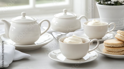 tea, cup, teapot, cream, porcelain, white, table, setting, afternoon, drink, cookie, dessert, food, beverage, elegant, classic, luxury, home, kitchen, still life, sweet, delicious, creamy, pastry, cafes, breakfast, morning, light, bright, calm, serene, cosy, comfort, relaxing, leisure, refined, simple, dish, saucer
