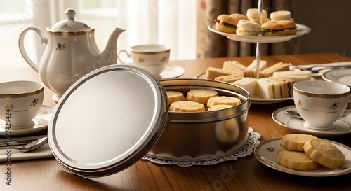 Elegant Afternoon Tea Spread - Cookies, Teapot, Cups, and Sandwiches on a Wooden Table.