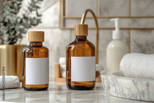 Elegant amber glass bottles with wooden caps on a marble countertop in a modern bathroom setting.