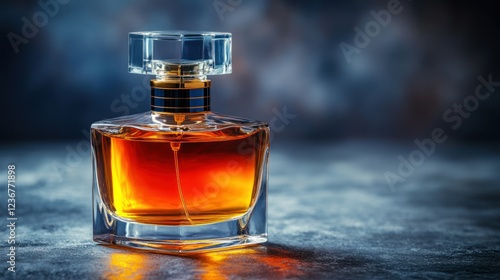 Elegant amber perfume bottle on textured surface, dramatic backdrop