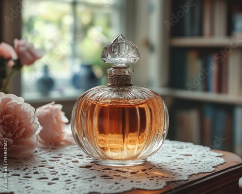 perfume, bottle, fragrance, amber, glasses, flower, pink, lace, doily, window, light, book, bookshelf, elegant, sophisticated, beauty, luxury, calm, tranquil, still life, marketing, advertising, commercial, image