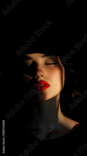 Elegant and Mysterious Portrait of a Woman with Red Lips and Black Hat in Dramatic Lighting for Minimalist and Stylish Aesthetic