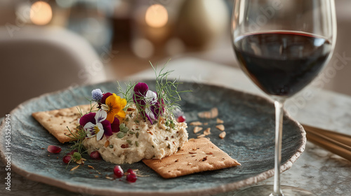 Elegant Appetizer with Wine: A delectable appetizer, featuring creamy fish spread garnished with edible flowers, served with crackers.