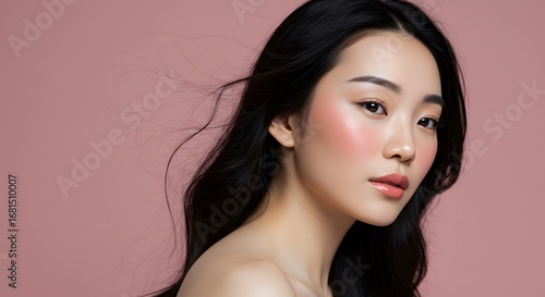 asian woman, beauty, portrait, make-up, natural beauty, rosy cheeks, long hair, dark hair, elegant, serene, female, model, studio shot, closeup, face, head shot, skincare, cosmetic, glamour, youth, health, wellness, lifestyle, fashion, hair, coiffure, beauty product, aesthetic, gentle, soft, radiant, clean, minimalist, attractive, pretty, cosmetic, advertisement, advertising, commercial