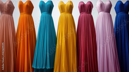 dress, gown, pleated, fashion, evening dress, elegance, vibrant, clothing, colourful, special occasion, attire, style, textile, rainbow, fabric, material, design, beauty, woman, apparel, celebration, party, clothes rack, collection, full-length, assortment, colours, luxurious, chiffon, bodice, skirt, flowing, drape, texture, trendy, modern, chic, aesthetic, contemporary, studio shot, display, glamour