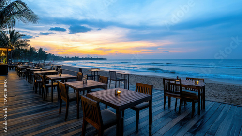 Elegant beachfront restaurant with wooden tables overlooking serene ocean at sunset
