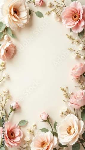 Elegant beige and white floral birthday backdrop Delicate blooms, soft pastel hues , photography, light, image