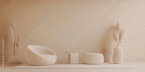 neutral, minimalist, design, interior, decor, beige, cream, furniture, chair, round, table, ottoman, vase, plant, dried, feather, wall, background, empty, light, shadow, modern, living, room, style, contemporary, peaceful, calm, simple, home, arrangement, elegant, soft, texture, surface, clean, indoor, space, lifestyle, natural, aesthetic, presentation, display, detail, monochromatic, composition, serene, studio