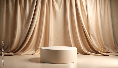 Elegant Beige Product Display Round Pedestal Curtains with Studio Stage Background.