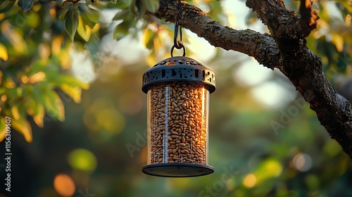 bird, feeder, hanging, tree branch, tree, seed, sunflower, nut, food, garden, outdoors, nature, sunlight, glasses, metal, container, elegant, design, rustic, autumn, summer, spring, wildlife, bird, backyard, landscape, bokeh, background, green, brown, dark, light, shadow, clear, transparent, ornament, decoration, habitat, feeding, animal, wild, natural