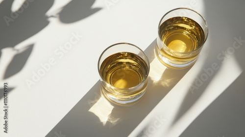 Elegant bird's eye view of two glasses of golden wine casting shadows on a light grey surface ideal for wine promotions or culinary content