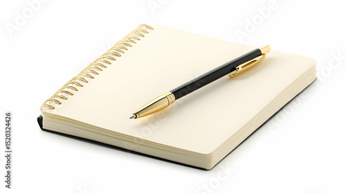 Elegant black and gold pen resting on a blank spiral notebook isolated on white