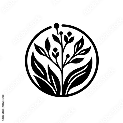 Elegant Black and White Circular Botanical Emblem: Stylized Plant with Leaves and Berries within a Perfect Circle, Minimalist Design on White.