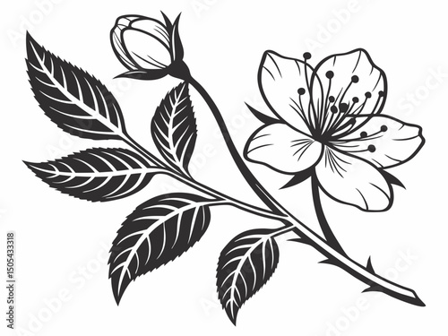flower, floral, blossom, bloom, bud, tree branch, leaf, stem, ink, vector, vignetting, drawing, outline, monochrome, black, white, minimalist, elegant, vintage, ornate, botanical, nature, graphic, illustration, design, art, aesthetic, decor, decoration, tattoo, symbol, element, craft, hand-made, hand-drawn, engraved, natural, wild, organic, foliage, plant, garden, spring
