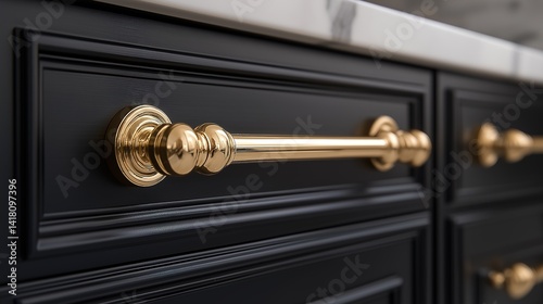Elegant black and white kitchen with marble countertop and gold fixtures, blending modern luxury with timeless design