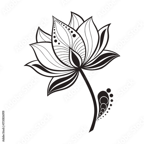 lotus, flower, floral, botanical, nature, plant, blossom, stem, leaf, black-and-white, monochrome, outline, line art, drawing, illustration, decorative, ornamental, zen, meditation, spirituality, peace, serenity, beauty, elegance, design, graphic, symbol, art, tattoo