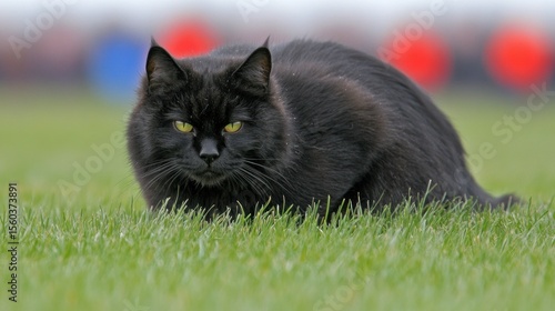 black cat, cat, felino, domestic cat, pet, animal, grass, greengrass, crouching, alert, watchful, yellow eyes, portrait, nature, fur, fluffy, garden, backyard, predator, mammal, carnivore, whisker, cute, beautiful