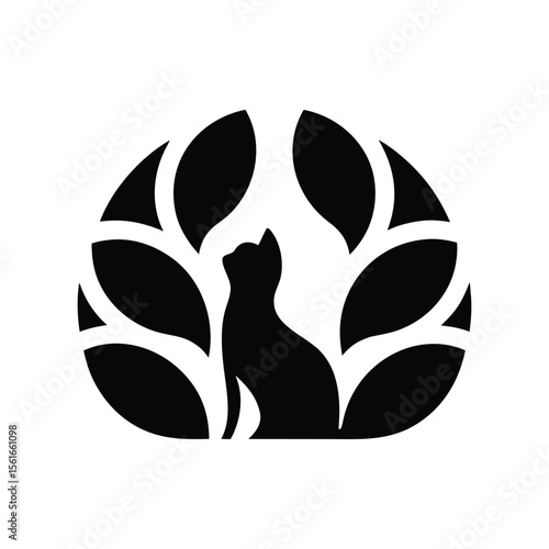 Elegant black cat silhouette framed by leaf motifs, ideal for eco-friendly logos or pet art. Stylish, nature-inspired design