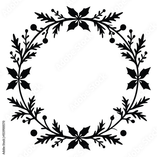 christmas, chaplet, holiday, vector, illustration, design, decoration, ornament, floral, frame, holly, leaf, berry, black, white, silhouette, circle, round, elegant, festive, winter, season, botanical, nature, graphic, element, border, isolated, greeting, invitation, card