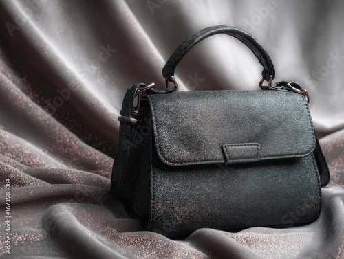 Elegant Black Glitter Handbag with Metallic Handles on Soft Shimmering Fabric Background