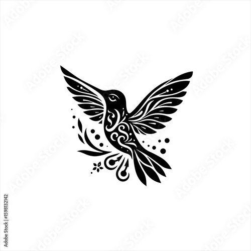 hummingbird, bird, ornate, elegant, swirl, floral, nature, wildlife, silhouette, black-and-white, graphic, design, illustration, art, symbol, icon, decoration, ornament, stylised, decorative, flying, wing, feather, beauty, graceful, delicate, minimalist, vector, isolated, white background