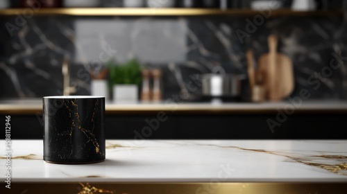 Elegant black marble cup on a luxurious kitchen countertop with modern decor and utensils