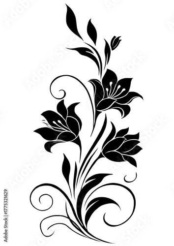 floral, black, metallic, swirl, ornament, flower, leaf, vine, curve, design, glossy, shiny, elegant, decorative, pattern, art, abstract, texture, three-dimensional, reflective, shape, style, illustration, vector, luxury, bloom, detail, isolated, transparent, motif, scroll, artistic, filigree, vintage, stem, dark, graceful, botanical, creative, modern