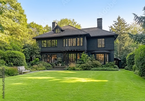 house, architecture, garden, lawn, exterior, modern, home, residential, nature, landscape, vegetation, black, window, design, calmness, greenery, peaceful, environment, real estate, investment, relaxation, scenery, rural, beautiful, country, luxury, summer, sunlight, property, stylish, aesthetic, front yard, suburb, landscaping, serene, peacefulness, roomy, structure, contemporary, inviting, facades, harmony, seasonal, beauty, weekend, lifestyle