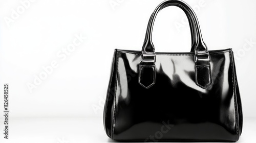 Elegant black patent leather fashion handbag on a clean white background showcasing contemporary design and style.