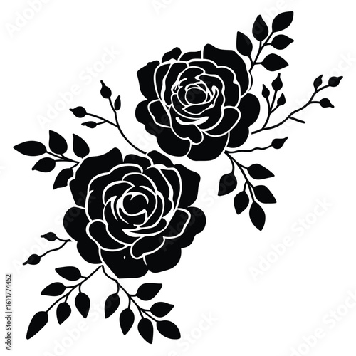 black, silhouette, rose, flower, leaf, bud, floral, botanical, elegant, decorative, design, illustration, graphic, art, nature, romantic, vintage, classic, simple, clean, isolated, white background, ornamental, bloom, stem, tree branch, foliage, growth, beauty, delicate, graceful, stylised, artistic, vector, graphic design, floral arrangement, wedding, invitation, greeting card