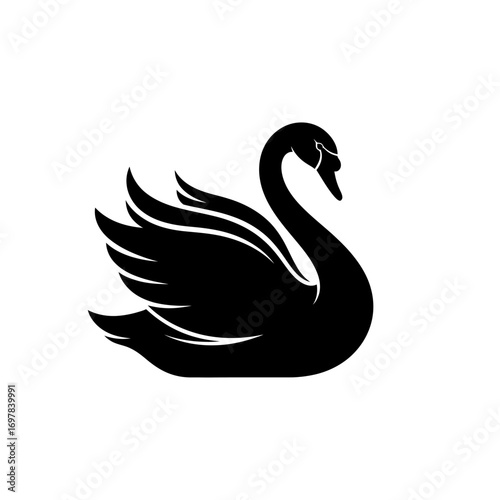 Elegant black swan with gracefully curved neck and stylized feathers, isolated on a white background.