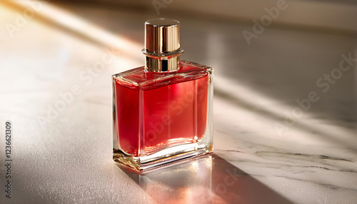 Elegant Blank Perfume Bottle Mockup with Red Liquid in a Warm Temperature. Perfume with Marble Background and Natural Daylight.