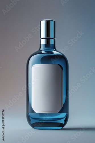 bottle, perfume, glasses, blue, design, cardboard box, label, fragrance, cosmetic, product, beauty, container, liquid, clear, transparent, elegant, modern, style, fashion, luxury, premium, shiny, clean, minimal, simple, template, marketing, advertising, branding, presentation, illustration, render, three-dimensional, cap, lid, chrome, metal, empty, blank