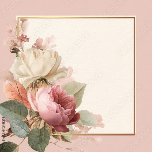 rose, floral, flower, invitation, wedding invitation, greeting card, template, design, background, watercolor, vintage, romantic, elegant, soft, delicate, beautiful, pastel, leaf, botanical, floral pattern, rose bouquet, pink rose, floral background, frame, border, reddening, cream