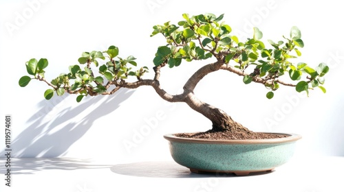 Elegant bonsai tree in a ceramic pot, gentle shadows, natural sunlight effect, isolated on white background