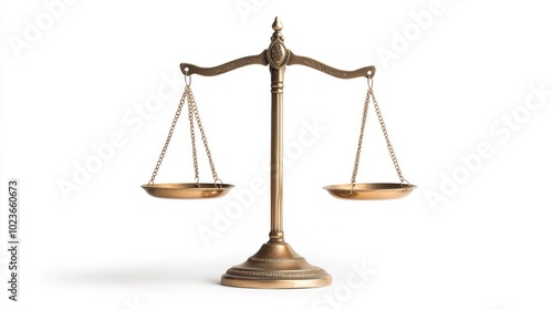 Elegant brass scales of justice in perfect equilibrium, isolated on a white background, representing fairness. No people.