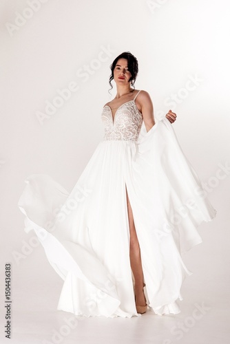 bridal, gown, wedding, dress, fashion, model, studio, shoot, elegant, attire, flowing, fabric, stylish, design, portrait, beauty, look, white, accessory, pose, femininity, glamour, simplicity, professional, inspiration, lighting, intricate, detail, movement, elegance, style, sewing, graceful, woman, soft, flair, silhouette, timeless, modern, romantic, trend, showcase, aesthetic, expression