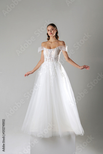bridal, gown, model, white, dress, tulle, skirt, fashion, studio, elegance, wedding, attire, design, minimalist, background, sewing, formal, wear, femininity, beauty, craftsmanship, texture, styling, detail, show, artistry, fitting, lighting, contemporary, luxurious, aethereal, pose, silhouette, runway, showcase, clothes rack, accessory, visual, art, presentation, elegant, modelling, high, sophisticated, trend, chic, figure
