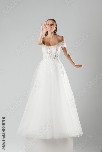 Elegant bride in a white wedding dress striking a pose against a simple gray background
