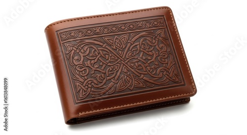 billfold, leather, brown, embossed, design, pattern, celtic, knot, traditional, menswear, accessory, fashion, style, luxury, craftsmanship, handcraft, vintage, retro, heritage, artisan, detailed, ornate, sophisticated, elegant, money, clip, card, holder, personal