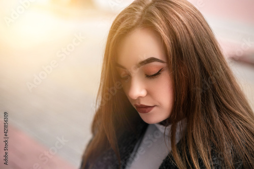 Elegant busy pretty woman sitting outside street cafe coffee shop looking at phone. Confident cute female businesswoman thinking about her small business. Image with copy space.