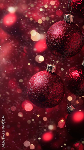 christmas, new year, ornament, bokeh, background, wallpaper, holiday, celebration, festive, red, bauble, decoration, greeting, card, postcard, winter, season, sparkle, glistering, light, bright, beautiful, elegant, stylish, classic, luxury, closeup, macro, detail, texture, surface, blurred, soft, warm, vibrant, creative, artistic, design, vertical, space, copy, invitation, event, party, gift, joy