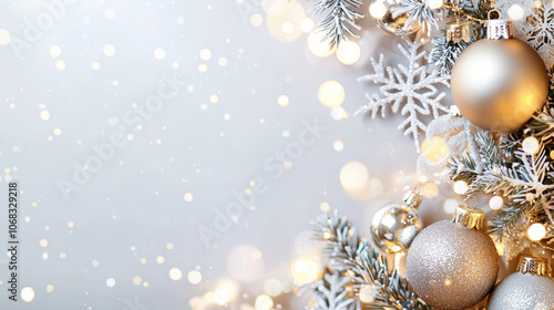 Elegant Christmas decorations featuring silver and gold ornaments, snowflakes, and twinkling lights against a soft, blurred background
