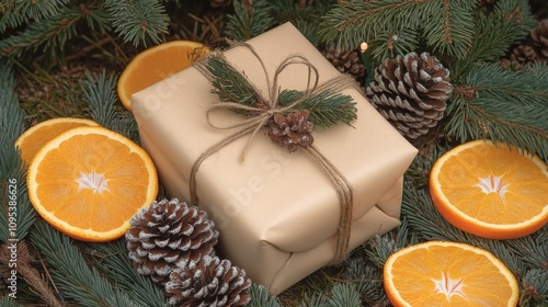 Elegant Christmas Gift Surrounded by Oranges and Pinecones