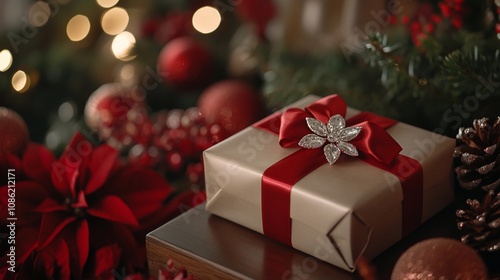 christmas, gift, present, red, ribbon, ornament, holiday, festive, season, winter, decoration, celebration, christmas, tree, light, bokeh, background, beige, box, wrapping, shiny, sparkle, christmas flower, pine, cone, luxurious, elegant, beautiful, joy, happiness, family, love, merry, magical, december, eve, night, warm, cosy