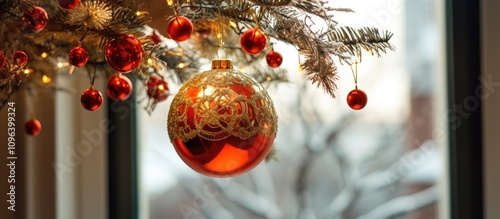 Elegant Christmas ornament hanging from a decorated artificial tree with a festive winter backdrop and warm glowing lights.
