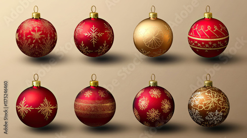 Elegant Christmas Ornaments with Gold and Red Patterns on Display