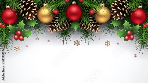 Elegant Christmas Pine Garland with Ornaments on White Background