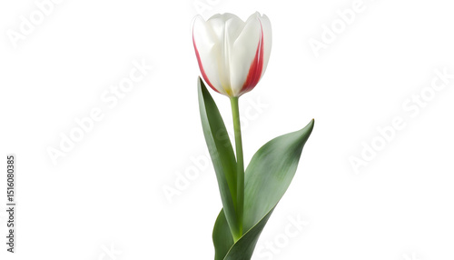 Elegant close up of a white tulip with red veining and lush green leaves against a clean white background