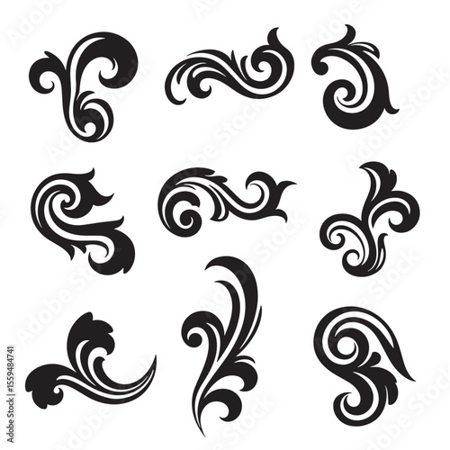 Elegant collection of ornate vintage art silhouette decorative swirls and flourishes for design projects and graphic elements